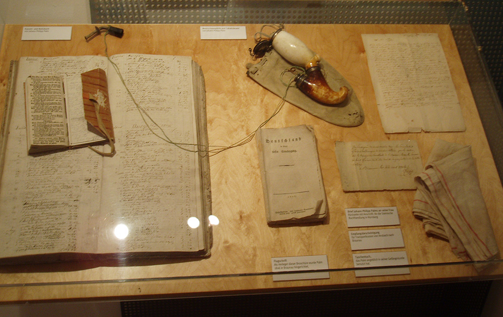 Geboren am 18. November 1766 in Schorndorf, lernte Johann Philipp Palm den Buchhandel bei seinem Onkel Johann Jakob Palm in Erlangen, wurde später Gehilfe in der Steinschen Buchhandlung in Nürnberg. Im Juli 1806 erschien in Palms Verlagsschrift das 144-seitige Pamphlet "Deutschland in seiner tiefen Erniedrigung".