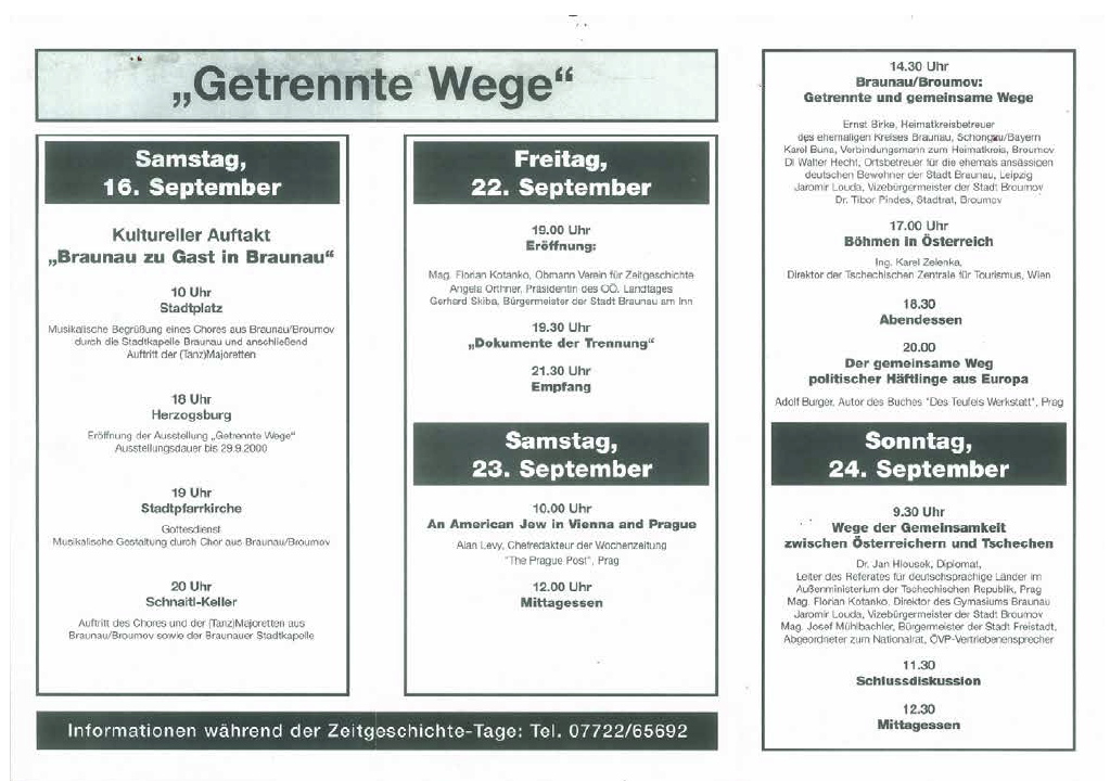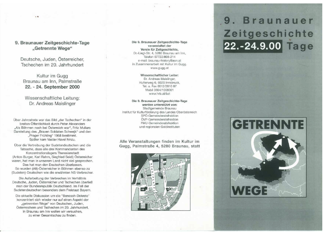 Die 9. Braunauer Zeitgeschichte-Tage widmeten sich vom 22. bis 24. September 2000 im Gugg einem besonders sensiblen Kapitel der europäischen Geschichte: „Getrennte Wege. Deutsche, Juden, Österreicher und Tschechen im 20. Jahrhundert.“