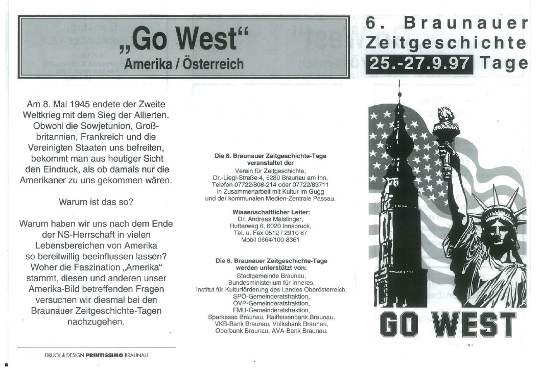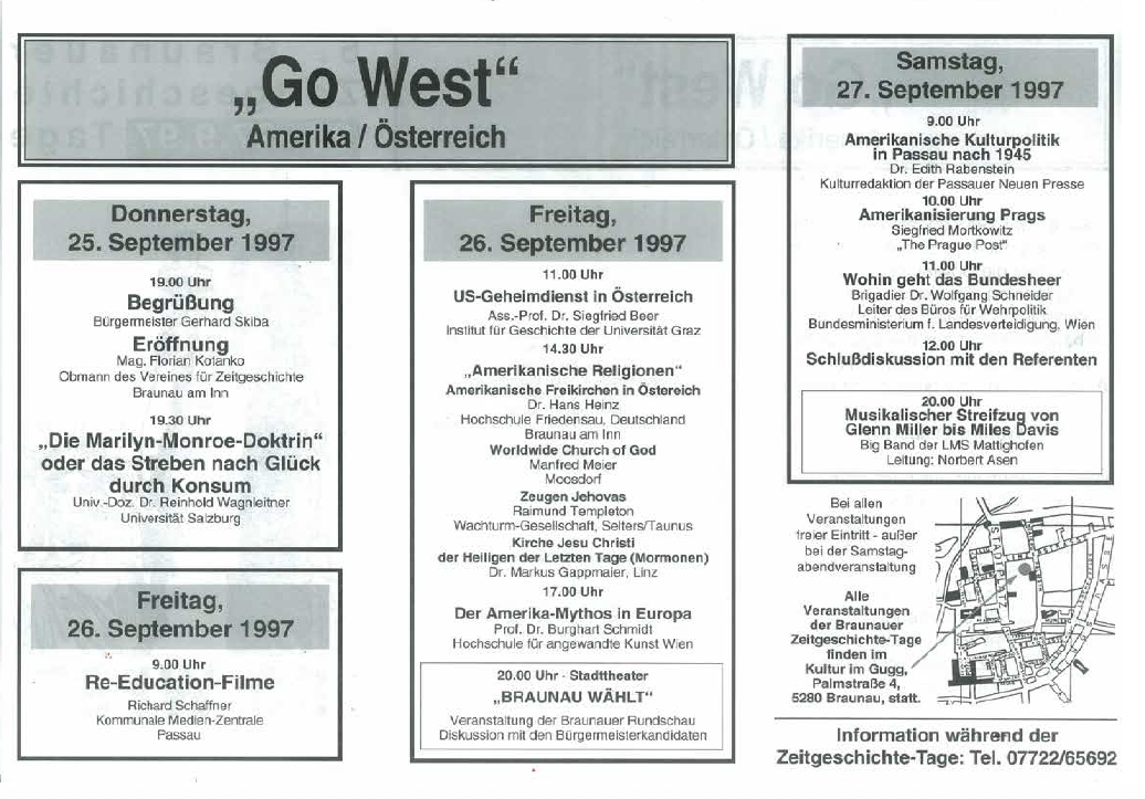 Die Zeitgeschichtetage 1997 fanden vom 25. bis 27. September im Kulturzentrum Gugg in Braunau statt. Im Mittelpunkt stand das Verhältnis zwischen den USA und Österreich nach dem Sieg der Alliierten 1945.